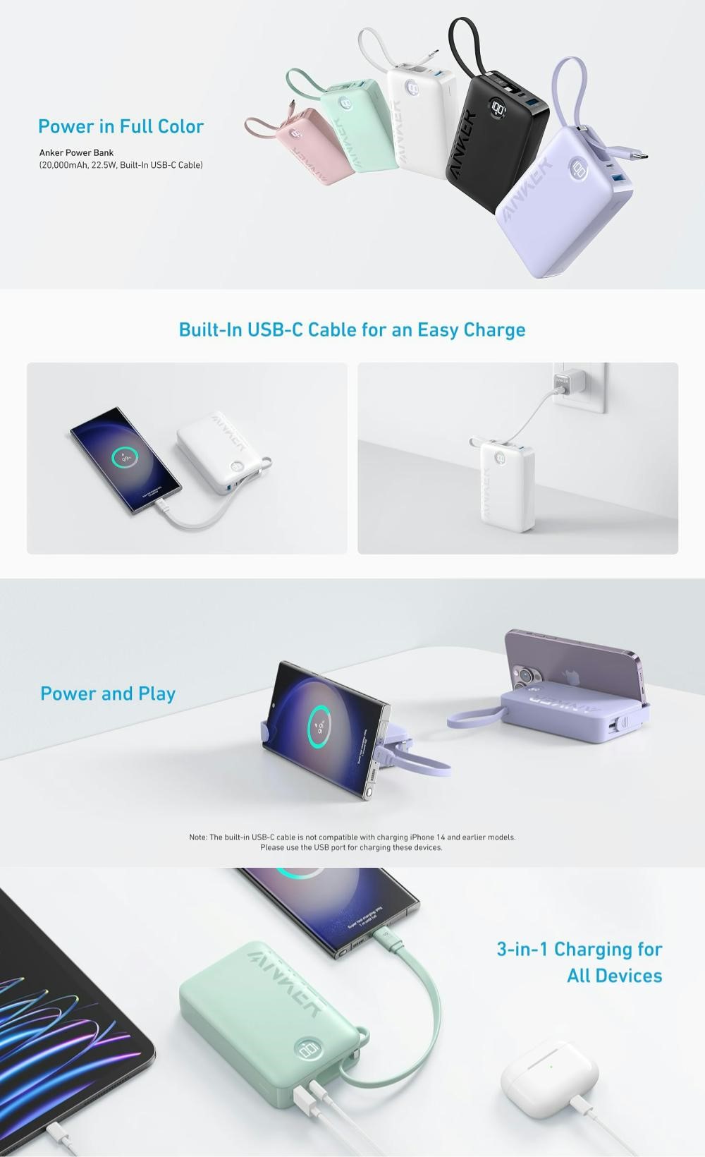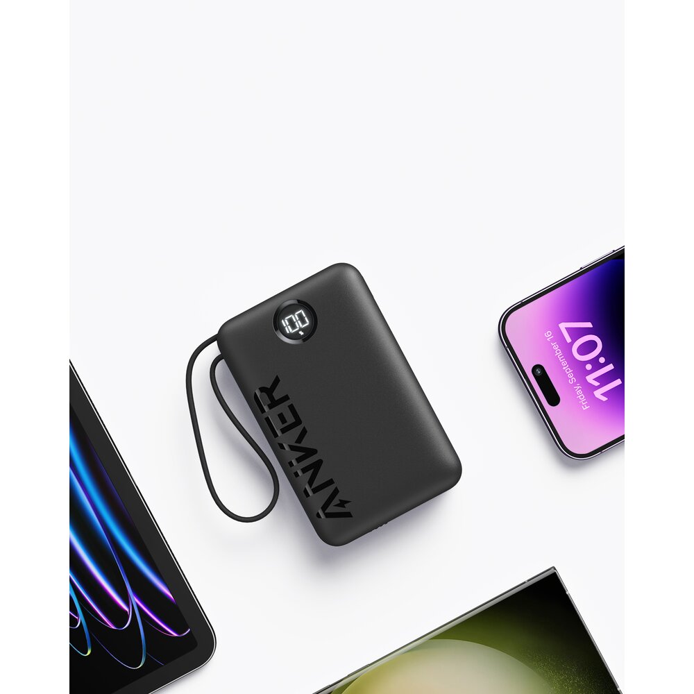 Cu un cablu USB-C incorporat, un port USB-C si un port USB-A, incarcati pana la trei dispozitive simultan.