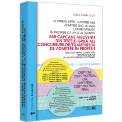 In continuarea primelor doua editii care se dovedesc a fi de un real succes in pregatirea candidatilor pentru concursuri si examene marturie fiind atat reusita celor care au folosit cu incredere acest instrument util cat si numarul de exemplare vandute prezenta carte din colectia Examene isi continua misiunea de pregatire si antrenare a cunostintelor juridice ale celor care sustin examenele de licenta si de admitere in profesie. Si de aceasta data in cuprinsul lucrarii sunt tratate in mod comparativ notiuni similare din cadrul unor materii diferite pentru a fi evitate confuziile intre institutiile asemanatoare asa cum este cazul stramutarii care in materie civila se solutioneaza in camera de consiliu si se pronunta printr-o incheiere iar in materie penala se solutioneaza in sedinta publica si prin sentinta. Aceasta carte isi propune sa fie un instrument deosebit de util in pregatirea examenelor si a concursurilor atat prin faptul ca trateaza principalele erori in rezolvarea testelor-grila cat si prin faptul ca explica intr-un limbaj clar si usor accesibil diferentele dintre notiunile cu grad ridicat de similitudine. Sunt expuse si liste exhaustive de exceptii de la reguli privind diferite institutii din tematica examenelor si este realizata o radiografie vasta a doctrinei avandu-se in vedere ultimele modificari legislative indeosebi cu privire la Codul penal si Codul de procedura penala aduse prin Legea nr. 51 2023 Legea nr. 171 2023 Legea nr. 200 2023 Legea nr. 201 2023 Legea nr. 213 2023 Legea nr. 214 2023 Legea nr. 217 2023 Legea nr. 248 2023 precum si cele referitoare la Codul civil si Codul de procedura civila prin Legea nr. 140 2022 si Legea nr. 57 2023. Nu in ultimul rand sunt reamintite si principalele opinii doctrinare iar in ceea ce priveste Dreptul penal Partea speciala unde ergenta de opinii intre Scoala de la Bucuresti si Scoala de la Cluj este mai accentuata in rezolvarea testelor-grila sunt expuse comparativ opiniile ambelor Scoli asa incat candidatii sa isi economiseasca timp pretios in pregatirea pentru concursuri si examene. - actiunea in contestarea recunoasterii de filiatie vs. actiunea in contestatia filiatiei - schimbarea locului citarii vs. alegerea locului citarii - stramutarea trimiterea cauzei la un alt parchet trecerea cauzei de la un organ de cercetare penala la altul sau preluarea cauzei la un alt parchet - infractiuni cu continut alternativ vs. infractiuni cu continuturi alternative -... si multe altele veti putea citi in prezenta lucrare.Specificatii