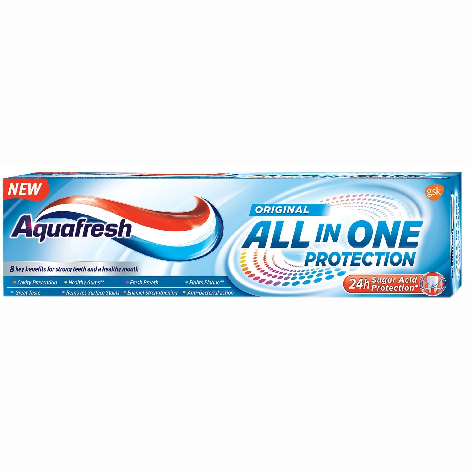 • Cum functioneaza: Pasta de dinti Aquafresh All in One Original are 8 beneficii cheie si ofera protectie impotriva zaharurilor* pe parcursul intregii zile, prin periaj de doua ori pe zi.