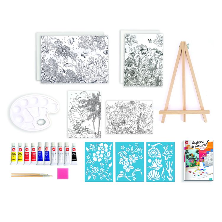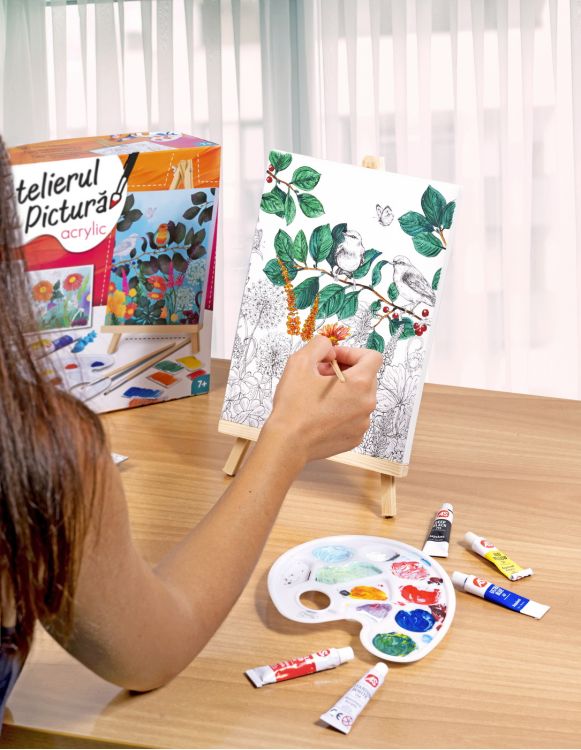 Cu Atelierul de Pictura cu Acrilice copilul poate deveni cu usurinta un pictor adevarat! Setul pune la dispozitie panze de pictura cu sabloane printate pentru desen in acrilic, o paleta, sevalet din lemn, bureti si pensule pentru o experienta creativa inedita! Pentru ajutor si sugestii de folosire, in pachet este inclus si un set de instructiuni ilustrat.