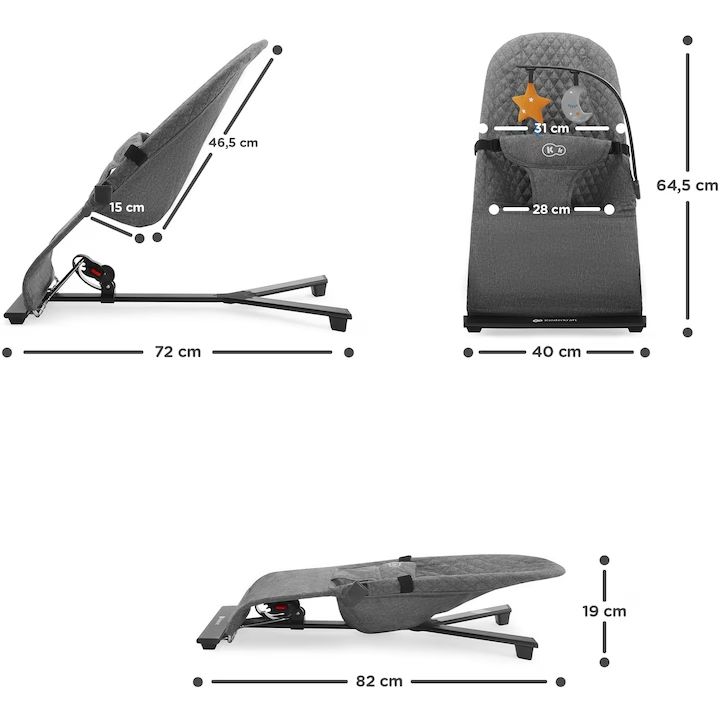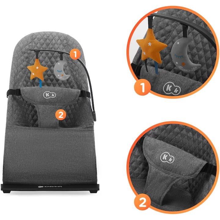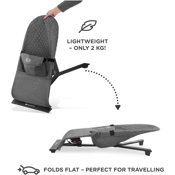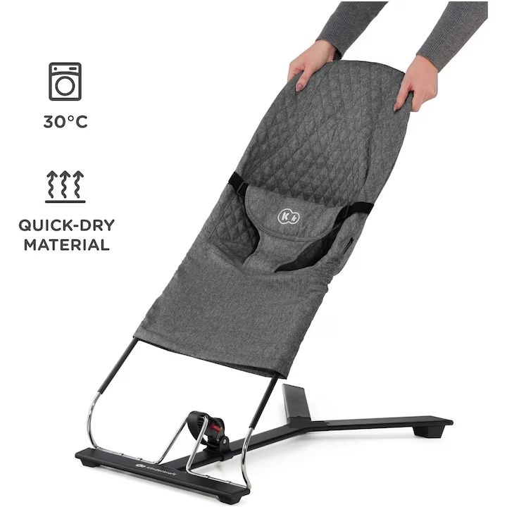 Copilului tau ii place sa fie leganat dar uneori ai impresia ca bratele tale sunt pe cale sa cada de la purtatul copilului tot timpul Ofera-i atunci un loc confortabil de relaxare MIMI GREY un balansoar minimalist care il va linisti pe copil in cateva clipe. Constructia usoara si montarea simpla iti vor permite sa-ti iei noul ajutor peste tot in vacante mai lungi sau vizite mai scurte la bunici. Copilul se va putea uita la marea fosnaitoare sau muntii inalti iar tu amp ndash il vei avea aproape de tine. Cu ajutorul lui MIMI GREY vei putea rasufla copilul va pune delicat balansoarul in miscare atunci cand va dori. Materialul placut imbratiseaza spatele si coloana copilului oferindu-i confort si siguranta iar in timpul acesta tu iti vei putea reface fortele avandu-l pe bebelus alaturi de tine. Balansoarul MIMI GREY este minimalismul intruchipat ambalat intr-o forma frumoasa. Siguranta confort si stil toate impreuna. Te ajuta sa il linistesti pe cel mic chiar si in cele mai agitate zile fara a-i oferi insa prea multi stimuli. Iar cand va dori sa se joace va avea la dispozitie 2 jucarii suspendate. Fara lumini sau sunete puternice. Il vei adapta cu usurinta la nevoile copilului cu ajutorul spatarului reglabil in 3 pozitii. sezutul ideal dintr-o tesatura placuta distribuie uniform greutatea copilului sprijina postura naturala in timpul odihnei. Avantaje Functionalitate Leganat natural copilul se leagana singur datorita miscarilor naturale ale corpului. si tu il poti legana delicat. Dezvoltare leganandu-se copilul isi dezvolta abilitatile motorii si echilibrul. De asemenea leganatul contribuie la odihna corespunzatoare si relaxarea copilului. Bara cu jucarii - 2 jucarii suspendate la balansoarul MIMI GREY ii vor atrage atentia copilului si ii vor face timpul petrecut mai placut. Il vor incuraja sa isi intinda mainile si sa exerseze apucarea lucrurilor. Design scandinav - balansoarul se va potrivi perfect oricarui interior. Va arata frumos in apartamente indiferent de stilul decorului. Solutii minimaliste - nu il stimuleaza in exces pe copil si il ajuta sa se odihneasca. Confort Reglare in 3 pozitii a spatarului este usor sa alegi pozitia potrivita pentru copil. Alegi pozitia in functie de greutatea si nevoile bebelusului. sezut adaptat - sezutul distribuie uniform greutatea copilului. Coloana bebelusului se asaza natural sprijinindu-i postura optima. Perfect pentru calatorii - balansoarul este foarte usor si deosebit de simplu de pliat. Il vei lua cu tine in fiecare calatorie alaturi de copilul tau. Material moale - balansoarul este acoperit cu o tesatura placuta la atingere. Se poate spala la masina la 30 de grade. tesatura cu uscare rapida amp ndash se usuca in doar cateva ore. Speli materialul seara iar dimineata balansoarul va fi deja pregatit pentru joaca de zi cu zi Siguranta Centuri in 3 puncte - centurile de siguranta se pot regla astfel incat sa potriveasca copilului. Au o protectie lata si moale care va proteja picioarele delicate ale celor mici. Constructie stabila - balansoarul MIMI GREY are o baza solida care confera constructiei o stabilitate deosebita. Copilul va fi in siguranta tot timpul. Elemente antiderapante - fac imposibila deplasarea balansoarului in timpul leganatului protejand in acelasi timp podeaua impotriva zgarieturilor. Standarde-MIMI GREY indeplineste norma europeana EN 12790 pentru balansoarele de bebelusi. Fabricatie Materiale cadru aluminiu tesatura poliester Greutate 2 35 kg Dimensiunile greutatea ambalajului 47 x 11 x 82 cm 2 75 kg Spalare la masina da 30 de grade Pentru copii de la nastere pana la 9 kg sau pana cand copilul incepe sa stea in sezut .Specificatii