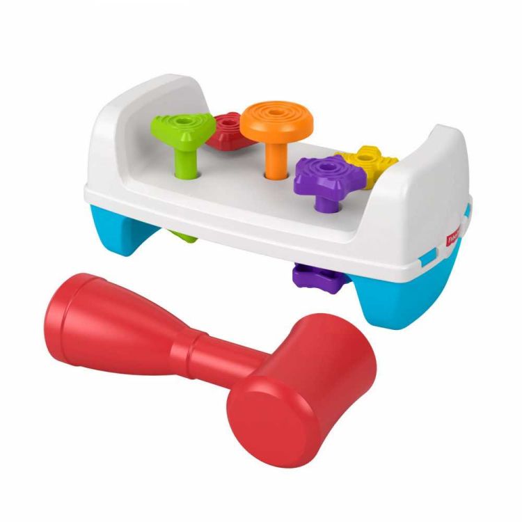 Cu ajutorul bancului de lovit de la Fisher-Price copiii pot rasuci, trage si lovi diferite forme colorate ore intregi. Bancul de jucarie cu doua fete are forme colorate pentru ca micutul tau constructor sa poata apuca, rasuci sau atinge cu ciocanul de joaca. Joaca cu acest banc de lovit ajuta la dezvoltarea abilitatilor motorii fine, coordonarea mana-ochi si dexteritatii bebelusului, iar pe masura ce bebelusul descopera cum sa loveasca formele si sa intoarca bancul pentru a continua sa se joace, sunt incurajate abilitatile de rezolvare a problemelor.