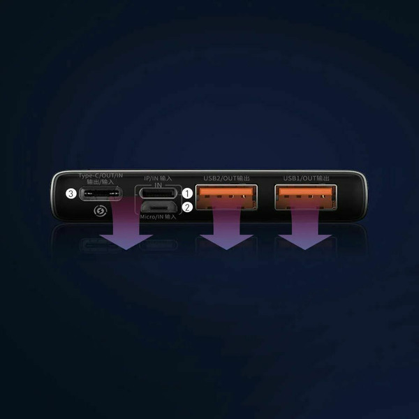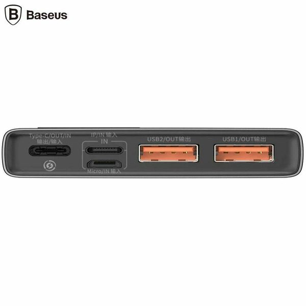 Bateria externa Baseus Adaman Metal 10000 mAh este dotata cu 2 porturi USB pentru alimentarea dispozitivelor mobile, un port MicroUSB pentru alimentarea bateriei si un port USB Type-C care poate fi folosit atat pentru alimentarea dispozitivelor cat si pentru cea a bateriei.