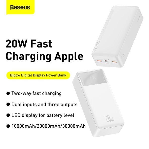 Baterie externa Baseus Bipow Digital Display, 30.000 mAh, 20W, 2x USB-A, 1x USB-C PD, cablu USB-A la microUSB inclus Alb