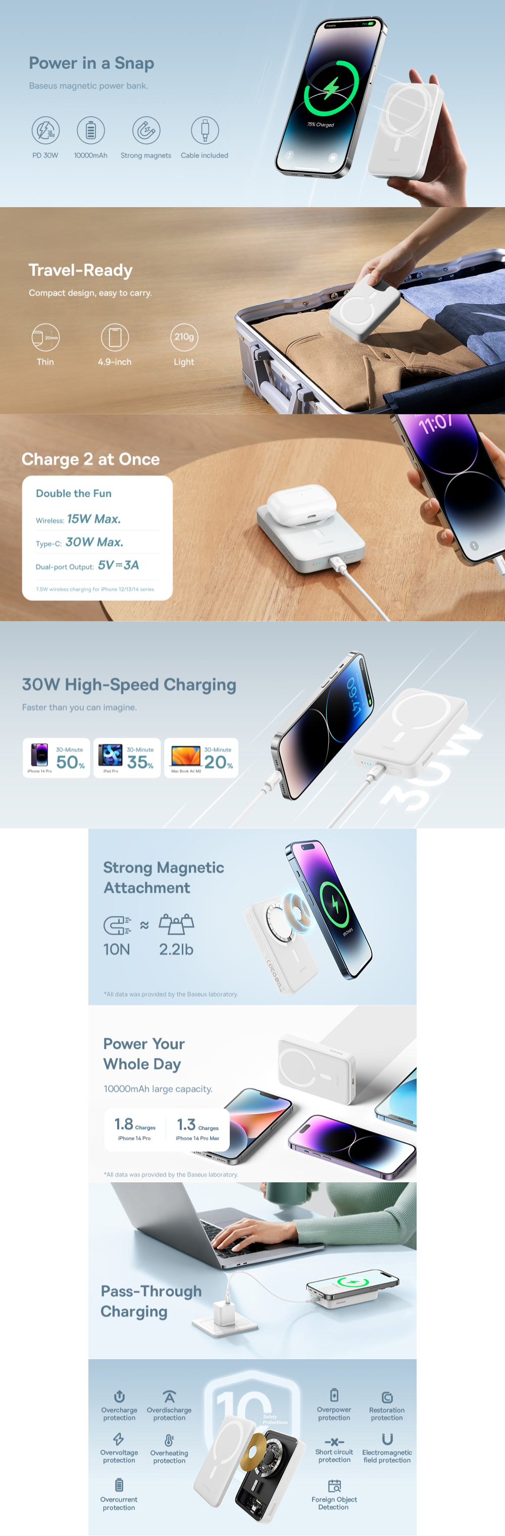 Bateria de ultima generatie garanteaza o incarcare sigura. Baseus ofera protectie impotriva supratensiunii, supracurentului, supraincarcarii si scurtcircuitului, printre altele. Powerbank-ul este, de asemenea, echipat cu senzori de temperatura NTC pentru a preveni supraincalzirea.