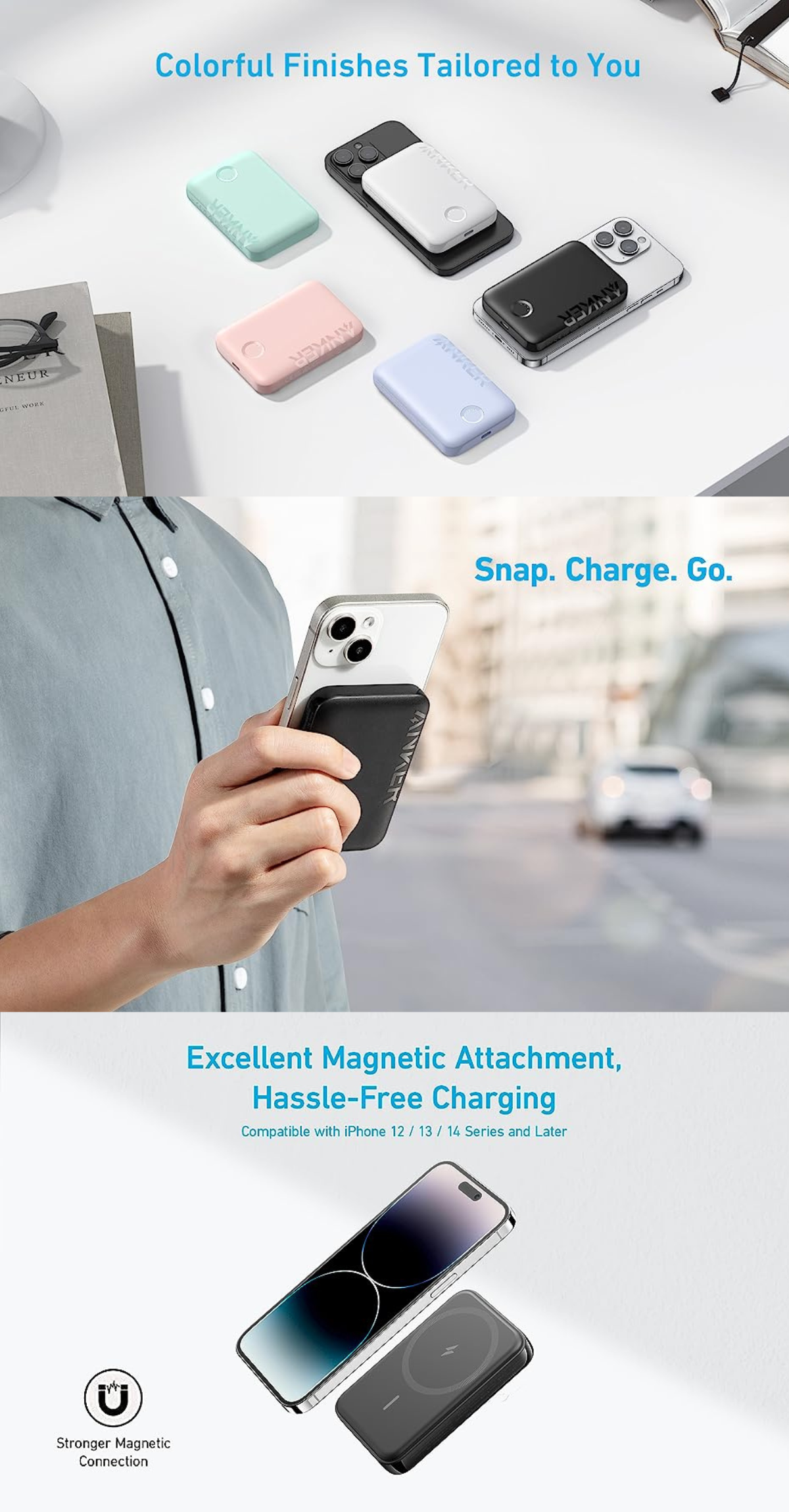 Baterie externa magnetica wireless Anker 321 MagGo, 5000 mAh, USB-C, pentru seria iPhone 12/13/14, Negru