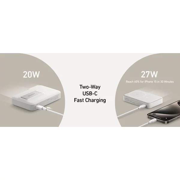 Baterie externa magnetica wireless Anker MagGo, Qi2, 10.000 mAh, 15W, USB-C, Suport Pliabil, Smart Display, pentru iPhone 15/14/13/12, Alba