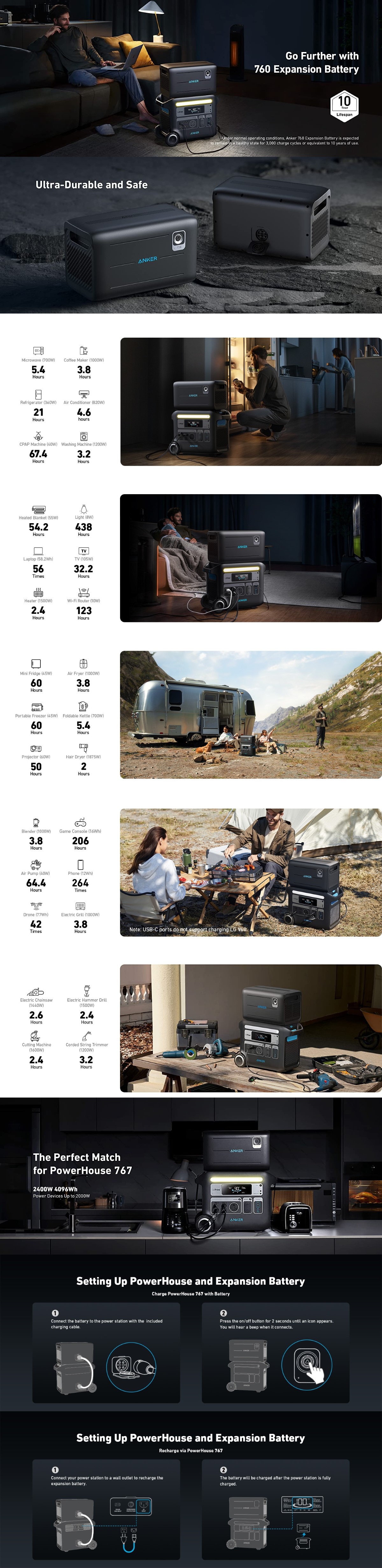 Folositi bateria de suplimentara Anker 760 (2048Wh) cu Anker PowerHouse 767 (2048Wh) si mariti capacitatea bateriei la 4096Wh.