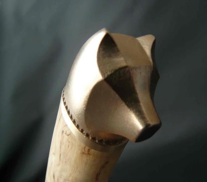 Acest cutit frumos are un cap de urs turnat in bronz ce finiseaza manerul. Tocul de piele are un imprimeu impresionant.