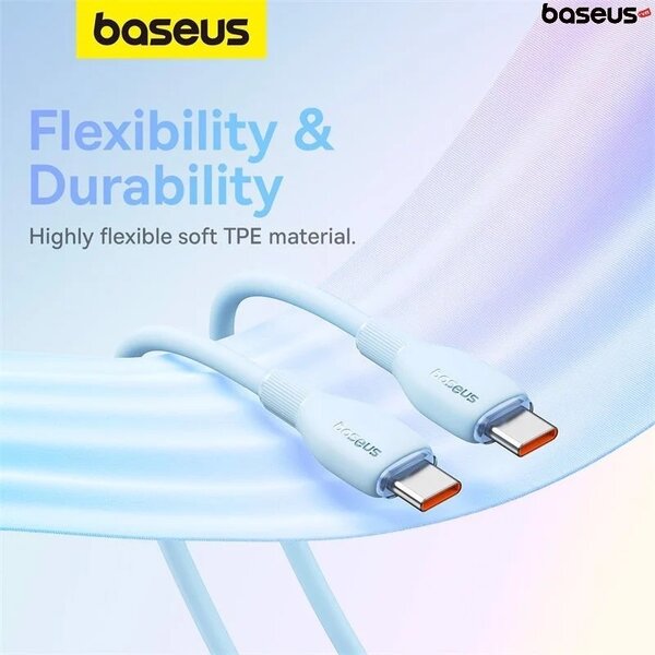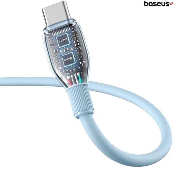 Cablul Baseus Pudding Series Type-C la Type-C 100W are culori elegante si un design unic cu o carcasa transparenta.