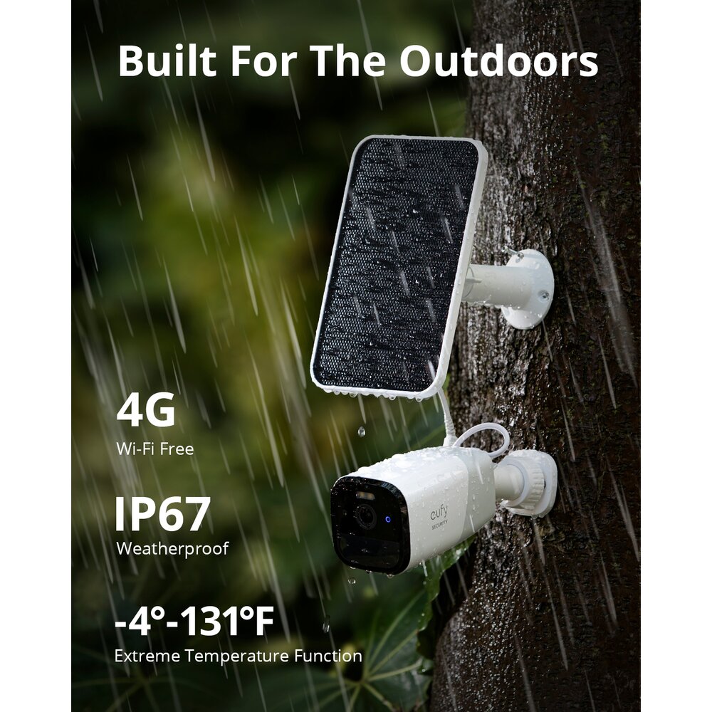 Eliminati cablurile si firele si instalati camera eufy Starlight 4G LTE oriunde fara Wi-Fi pentru o monitorizare usoara. Cu rating IP67, ramane protejata de ploaie, praf si temperaturi extreme de -20°C-50°C.