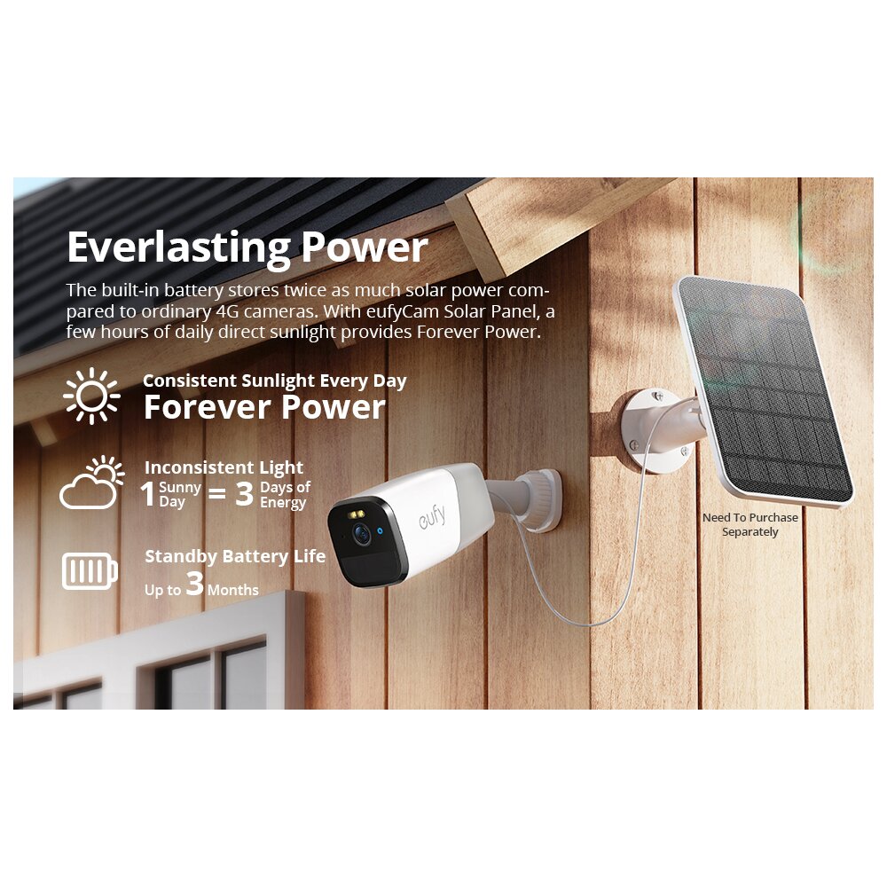 Bateria incorporata stocheaza de doua ori mai multa energie solara in comparatie cu alte camere 4G. Evitati inlocuirea constanta a bateriilor cu pana la 3 luni de energie de lunga durata. Iar daca instalati incarcatorul eufyCam Solar Panel (nu este inclus in pachet), nu va mai fi nevoie sa schimbati niciodata o baterie datorita incarcarii solare.