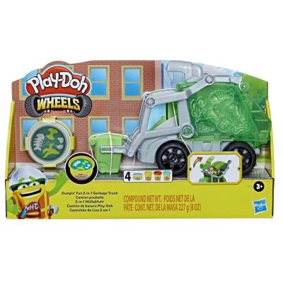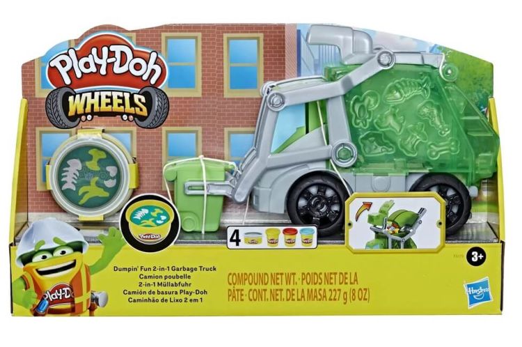 Distractie 2 in 1 in stilul creativ Play-Doh Foloseste pasta modelatoare pentru a modela forme de cotoare de mere sticle doze si alte obiecte reciclabile care vor fi apoi incarcate in pubela Camionul poate ridica pubela si poate modela deseurile Play-Doh sub forma unui sac de deseuri menajere Cutia speciala Play-Doh acunde modele de deseuri menajere compostabile. Setul include in total 4 cutii cu pasta modelatoare non-toxica Play-Doh greutate totala 227 g . Fii creativ si invata sa reciclezi alaturi de Play-DohSpecificatii