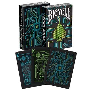 Cartile de joc Bicycle Dark Mode sunt ideale pentru o noapte de gaming sau pentru o demonstratie de trucuri cu carti. Designul lor este inspirat din lumea digitala circuitele imprimate utilizate pentru transferul de date fiind prezente pe fiecare carte. Bicycle Dark Mode este un pachet de carti de joc cu aspect SF de o calitate deosebita reprezentativa pentru brand-ul Bicycle. Finisajul cartilor este Classic Air-Cushion Finish pentru amestecare usoara si performanta optima. Dimensiuni poker size 88 x 63 mm. Imprimate pe carton premium marca Bicycle si fabricate in SUA.Specificatii