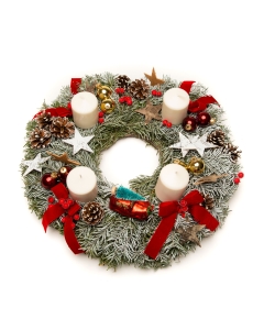 Dintre modele de coronita Craciun intalnite in oferta grupdzc.ro, regasesti Coronita Brad Natural Red Touch, handmade, care iti aduce o combinatie inedita de rosu si auriu, perfecta pentru mesele in familie datorita celor 4 lumanari albe asezate pe patul de ramuri de brad impodobit cu fundite, stelute si conuri de brad.