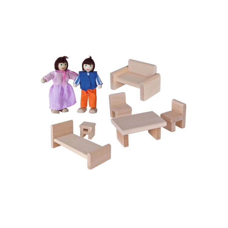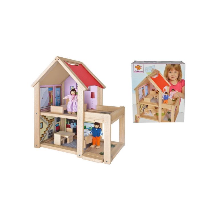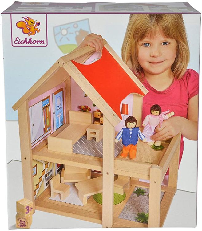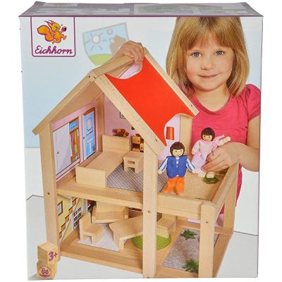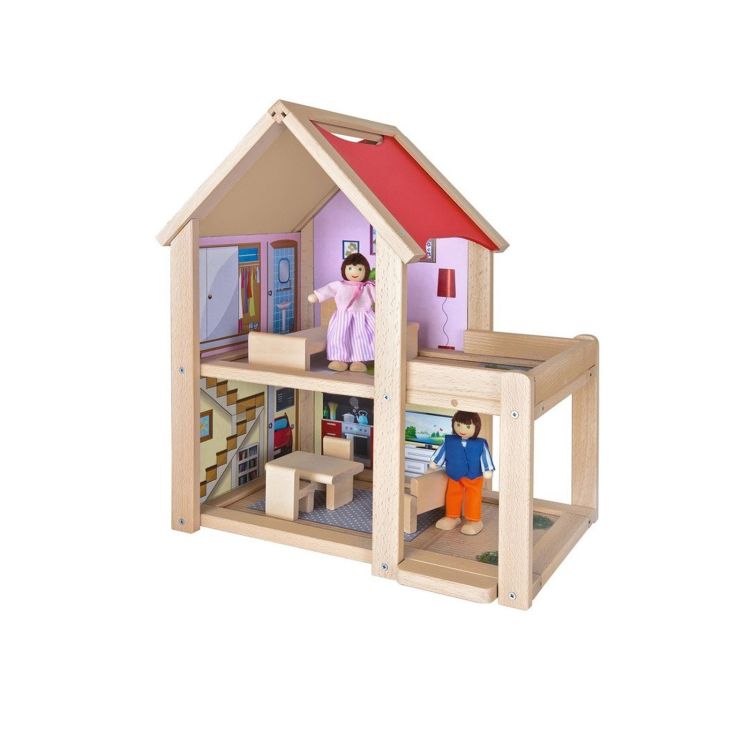 Cu aceasta casuta din lemn pentru papusi si cu cele doua papusi din set, poti juca nenumarate aventuri si intamplari.
