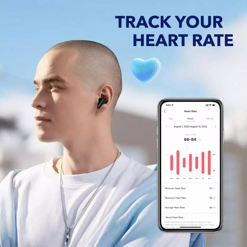 Senzorul de ritm cardiac in ureche urmareste ritmul cardiac in timp ce ascultati pe parcursul zilei. Verificati datele zilnice, utilizati in timp ce faceti exercitii fizice si multe altele prin intermediul aplicatiei Soundcore Wellness.
