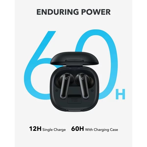 Cu tehnologie HearID, aplicatie dedicata SoundCore pentru iOS si Android. Ofera o autonomie de 12 ore cu o singura incarcare si 60 de ore cu carcasa de incarcare.