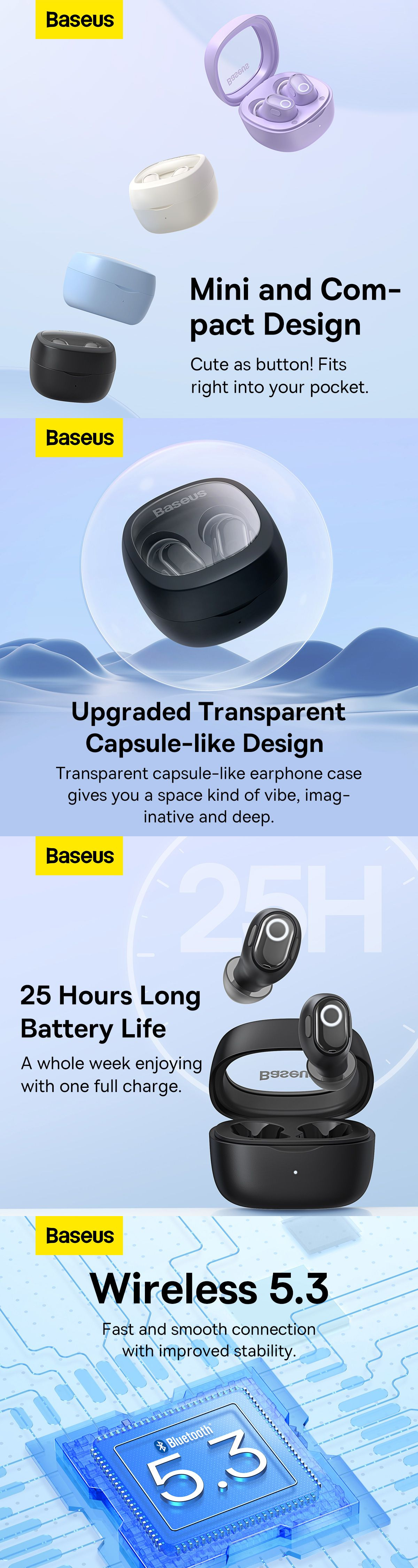 Baseus Bowie WM02 utilizeaza Bluetooth 5.3, care se remarca prin stabilitate exceptionala si consum redus de energie, astfel incat puteti uita de interferente si probleme de semnal. Un alt avantaj este latenta ultra-redusa de 60 ms, care asigura sincronizarea perfecta a videoclipurilor si a sunetului.