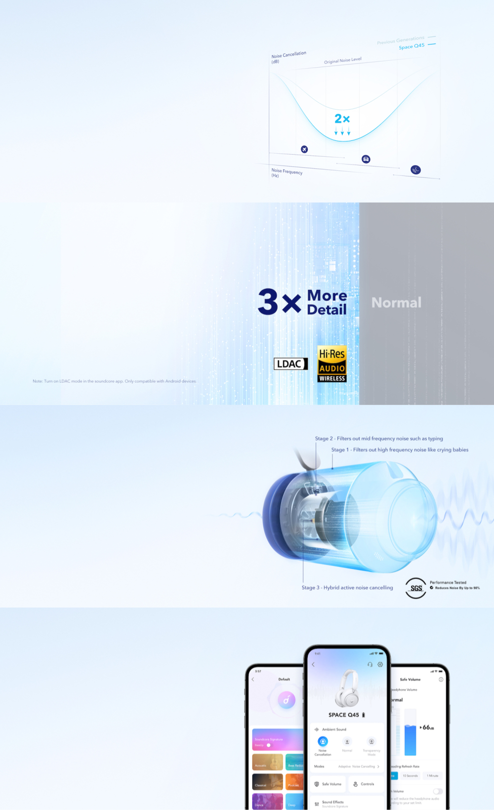 Difuzoarele de 40 mm au o diafragma inovativa cu strat dublu realizata din matase si materiale ceramice pentru a produce un sunet cu bas intens si inalte clare. Castile cu anulare a zgomotului Space Q45 suporta, de asemenea, LDAC pentru sunet Hi-Res Audio Wireless.Modul LDAC transmite cu pana la 3× mai multe date decat codecurile Bluetooth standard pentru o experienta uimitoare de inalta rezolutie, chiar si atunci cand utilizati castile Space Q45 Bluetooth in modul wireless.