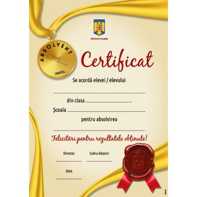 Certificatul de absolvire reprezinta o metoda de recompensare a elevilor speciala fiind destinat in special festivitatii de absolvire pentru finalizarea clasei a IV-a. Tipar fata-verso Insotit de panglicaSpecificatii