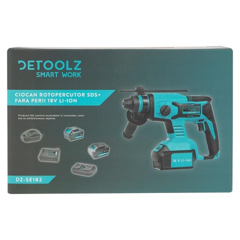 Ciocanul rotopercutor SDS+, 18V, fara perii Detoolz DZ-SE182 este un produs robust, eficient si usor de utilizat pentru operatiile de gaurire si daltuire a diverselor materiale: lemn, metal, beton, atat in cazul constructiilor noi, cat si pentru lucrari de renovare. Ciocanul rotopercutor SDS+, 18V, fara perii, Detoolz DZ-SE182 este proiectat si garantat pentru functionarea la temperature ambientale cuprinse intre + 5°C si 40°C la o altitudine de maxim 1000m peste nivelul marii. Umiditatea trebuie sa fie mai mica de 50% la 40°C. Poate fi depozitat sau transportat la temperaturi ambiante intre -25°C si 55°C. Ciocanul rotopercutor SDS+, 18V, fara perii, Detoolz DZ-SE182, are urmatoarele caracteristici: • Pentru reducerea efortului si timpului de lucru ciocanul dispune de mandrina SDS plus ce permite prinderi ferme si rapide adaptate lucrarilor de rotopercutie; • Acest ciocan rotopercutor este prevazut cu inversor al sensului de rotatie foarte util la deblocarea sculei; • Ciocanul rotopercutor DZ-SE182, permite orientarea la mana a pozitiei daltii dupa necesitati folosind sistemul Vario-Lock; • Motor fara perie – eficienta si cuplu ridicat, consum redus de energie precum si fiabilitate sporita si durata de viata. • Iluminare cu Led • Sistemul Li-Ion 18V permite utilizarea unei baterii cu diferite instrumente electrice si asigura performante consistente pentru o lunga perioada de timp. Capacitate maxima gaurire: • Beton - 22 mm • Metal - 13 mm • Lemn - 28 mm Nivel sonor ciocan rotativ •Lp: 89 dB; •LwA: 98 dB; •K: 3 dB Nivel sonor daltuire mod: • Lp: 92 dB; • LwA: 103 dB; • K: 3 dB Continut colet: • Ciocan rotopercutor ciocanul rotopercutor SDS plus, 18V, fara perii, Detoolz DZ-SE182; • Rigla de ghidaj; • Maner suplimentar; • Suport SDS; • Mandrina de plastic de 10 mm; • Manual de instructiuni. *Compatibil cu acumulator DZ-SE203, DZ-SE204 si incarcator DZ-SE205, DZ-SE206, DZ-SE207 *Produsul NU contine acumulator si incarcator, se achizitioneaza separat.Specificatii