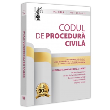 Editia a 20-a (revizuita) a lucrarii, Codul de procedura civila: mai 2024, tiparita pe hartie alba de calitate superioara si ingrijita de prof. univ. dr. Dan Lupascu, contine, pe langa textul actualizat al Codului de procedura civila (cu noua modificare adusa prin Legea nr. 139/2024 – M. Of. nr. 448 din 15 mai 2024), si: dispozitii de aplicare si conexe; decizii ale Curtii Constitutionale; recursuri in interesul legii, inclusiv Dec. ICCJ (RIL) nr. 8/2024 (20 mai 2024); hotarari prealabile; extrase din O. U. G. nr. 80/2013 privind taxele judiciare de timbru; Legea nr. 140/2022 privind unele masuri de ocrotire pentru persoanele cu dizabilitati intelectuale si psihosociale si modificarea si completarea unor acte normative (extras); Legea nr. 172/2022 pentru ratificarea Protocolului nr. 16 la Conventia pentru apararea drepturilor omului si a libertatilor fundamentale, adoptat la Strasbourg la 2 octombrie 2013 si semnat de Romania la Strasbourg la 14 octombrie 2014; Legea nr. 173/2022 pentru adoptarea unor masuri necesare punerii in aplicare a Protocolului nr. 16 la Conventia pentru apararea drepturilor omului si a libertatilor fundamentale, adoptat la Strasbourg la 2 octombrie 2013 si semnat de Romania la Strasbourg la 14 octombrie 2014 (extras). Indexul plasat la finalul Codului faciliteaza utilizarea acestuia, indicand sediul materiei pentru diverse institutii importante in domeniul procedurii civile si asigurand o cautare rapida a cuvintelor-cheie corespunzatoare. Lucrarea Codul de procedura civila: mai 2024 este destinata nu doar practicienilor si studentilor, ci si teoreticienilor interesati de acest domeniu.Specificatii