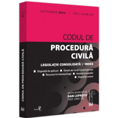 Editia a 18-a revizuita a lucrarii Codul de procedura civila septembrie 2023 tiparita pe hartie alba de calitate superioara si ingrijita de prof. univ. dr. Dan Lupascu contine textul Codului de procedura civila actualizat articolele Codului fiind insotite acolo unde este cazul de dispozitii tranzitorii de aplicare sau conexe necesare unei depline intelegeri a reglementarii. Volumul Codul de procedura civila septembrie 2023 cuprinde si decizii ale Curtii Constitutionale recursuri in interesul legii si hotarari prealabile Legea nr. 140 2022 privind unele masuri de ocrotire pentru persoanele cu dizabilitati intelectuale si psihosociale si modificarea si completarea unor acte normative extras Legea nr. 172 2022 pentru ratificarea Protocolului nr. 16 la Conventia pentru apararea drepturilor omului si a libertatilor fundamentale adoptat la Strasbourg la 2 octombrie 2013 si semnat de Romania la Strasbourg la 14 octombrie 2014 Legea nr. 173 2022 pentru adoptarea unor masuri necesare punerii in aplicare a Protocolului nr. 16 la Conventia pentru apararea drepturilor omului si a libertatilor fundamentale adoptat la Strasbourg la 2 octombrie 2013 si semnat de Romania la Strasbourg la 14 octombrie 2014 extras Legea nr. 220 2022 privind valorificarea adaptata a unor masuri dovedite benefice pentru institutiile din domeniul justitiei instituite pe perioada starii de alerta declarate in vederea prevenirii si combaterii efectelor pandemiei de COVID-19 extras . Indexul plasat la finalul Codului faciliteaza utilizarea acestuia indicand sediul materiei pentru erse institutii importante in domeniul procedurii civile si asigurand o cautare rapida a cuvintelor-cheie corespunzatoare. Lucrarea Codul de procedura civila septembrie 2023 este destinata nu doar practicienilor si studentilor ci si teoreticienilor interesati de acest domeniu.Specificatii