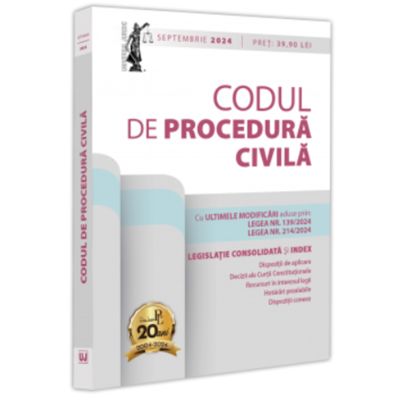 Editia a 21-a revizuita a lucrarii Codul de procedura civila septembrie 2024 tiparita pe hartie alba de calitate superioara si ingrijita de prof. univ. dr. Dan Lupascu include ultimele modificari aduse prin Legea nr. 139 2024 Legea nr. 214 2024. Sub articolele Codului se regasesc acolo unde este cazul dispozitii de aplicare decizii ale Curtii Constitutionale recursuri in interesul legii hotarari prealabile extrase din O. U. G. nr. 80 2013 privind taxele judiciare de timbru numeroase alte dispozitii conexe si referinte legislative deosebit de utile. Editia contine si Legea nr. 172 2022 pentru ratificarea Protocolului nr. 16 la Conventia pentru apararea drepturilor omului si a libertatilor fundamentale Legea nr. 173 2022 pentru adoptarea unor masuri necesare punerii in aplicare a Protocolului nr. 16 extras . Indexul plasat la finalul Codului faciliteaza utilizarea acestuia indicand sediul materiei pentru erse institutii de drept importante in domeniul procedurii civile si asigurand o cautare rapida a sintagmelor-cheie aferente. Lucrarea Codul de procedura civila septembrie 2024 este destinata magistratilor avocatilor consilierilor juridici notarilor executorilor judecatoresti arbitrilor mediatorilor expertilor judiciari practicienilor in general dar si teoreticienilor si studentilor intregului mediu universitar .Specificatii