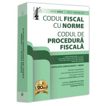 Editia a 8-a (revizuita) a lucrarii, Codul fiscal cu Norme si Codul de procedura fiscala: iulie 2024, tiparita pe hartie alba de calitate superioara, include noile modificari aduse prin: O. U. G. nr. 59/2024 (M. Of. nr. 534 din 7 iunie 2024); Legea nr. 192/2024 (M. Of. nr. 576 din 20 iunie 2024); O. U. G. nr. 70/2024 (M. Of. nr. 582 din 21 iunie 2024); O. U. G. nr. 78/2024 (M. Of. nr. 596 din 26 iunie 2024); Legea nr. 204/2024 (M. Of. nr. 600 din 27 iunie 2024).