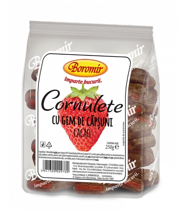 Cornulete cu Gem de Capsuni si Cacao, 250 g, Boromir