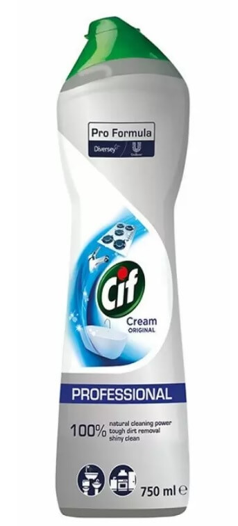 Crema de curatat profesionala Cif Cream Original 750ml este un curatitor ambalat cu milioane de particule naturale de curatare, ceea ce ofera o calitate excelenta si performanta pe pete dure fara a deteriora suprafetele delicate precum smaltul si vopseaua. Formula unica a Cif-ului crema curata adanc pentru a readuce suprafata la viata. Poate fi folosit ca detergent de bucatarie pentru curatat plite, chiuvete si gresie de bucatarie, precum si un detergent pentru baie pentru curatarea cazilor, chiuvetelor si placilor de baie.