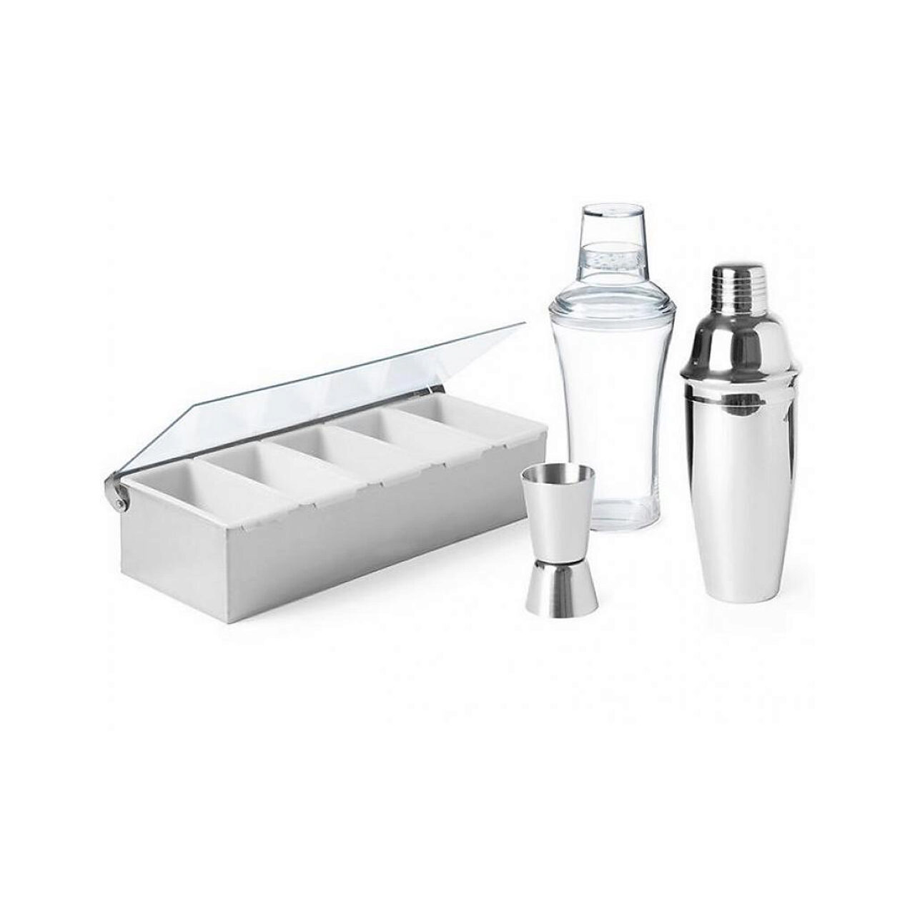 Cutie depozitare ingrediente cu 5 compartimente din Otel Inoxidabil si Polipropilena. Cu capac din plastic transparent. Include 5 containere albe pentru depozitare.Specificatii
