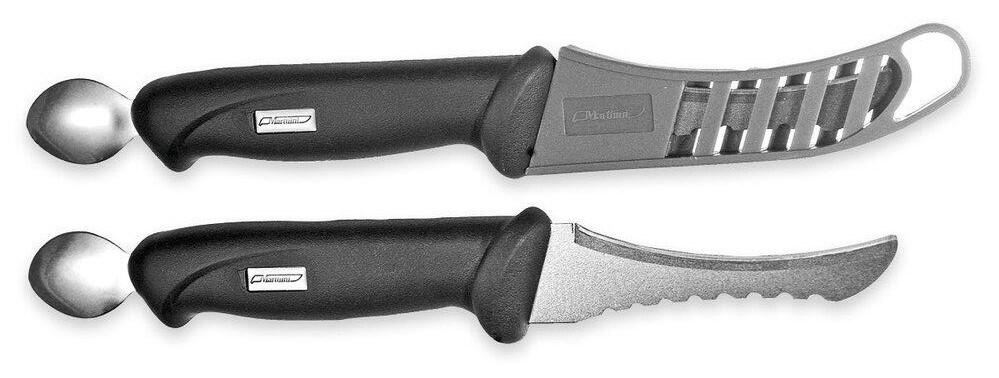 Cu lingura metalica la capatul manerului, se indeparteaza intestinele curat si rapid. Lama este protejata de teaca din plastic.