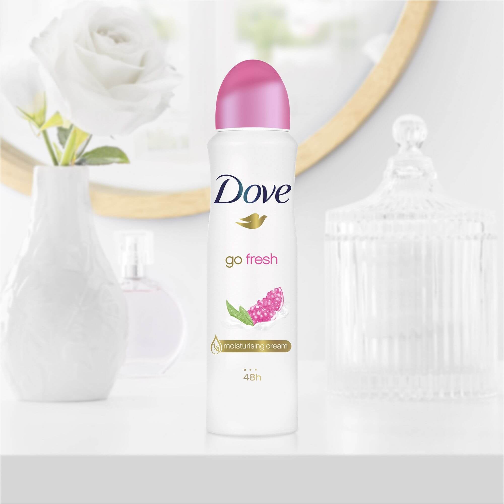 Agita spray-ul pentru a omogeniza ingredientele de protectie si de hranire. Apoi, tinand bratul ridicat deasupra capului, pulverizeaza produsul timp de aproape doua secunde de la o distanta de aproximativ 15 cm fata de subrat.Dove GoFresh Pomegranate & Lemon Verbena iti ofera 48 de ore de protectie eficienta impotriva transpiratiei, dar si o senzatie placuta de prospetime.
