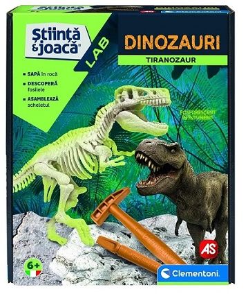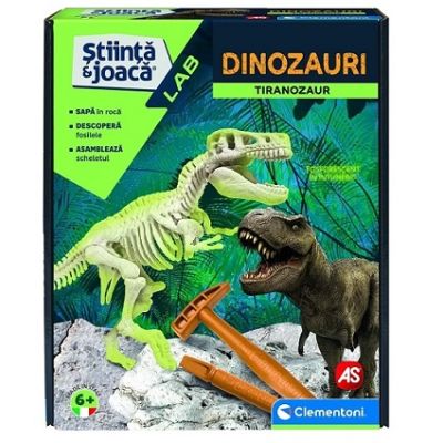 Pregateste-te pentru o calatorie fascinanta in trecut Cu uneltele unui paleontolog sapa si extrage fosilele antice ale celui mai feroce pradator peistoric Asambleaza scheletul Tiranozaurului si vezi cu devine fosforescent in intuneric te va fascina Descarca aplicatia gratuita Legendary creatures si distreaza-te cu realitatea augmentata si desene animate extraordinare. Setul este recomandat copiilor de la 6 ani producator Clementoni.Specificatii