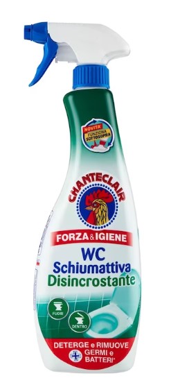 Din experienta Chanteclair vine noua spuma activa pentru ingrijirea completa a toaletei tale. Formula sa speciala care imbina perfect puterea de curatare cu igiena pentru indepartarea germenilor si bacteriilor*, are o textura placuta de spuma care adera pe peretii verticali ai toaletei si, de asemenea, actioneaza eficient impotriva reziduurilor de murdarie incapatanata, calcar, rugina. Datorita duzei sale inovatoare de pulverizare care functioneaza si invers, garanteaza o usurinta maxima de utilizare, ajungand cu usurinta in cele mai ascunse colturi ale baii dvs., in interiorul si in afara toaletei. * indepartarea mecanica a germenilor si bacteriilor. Nu este un dezinfectant. Avertisment: A nu se utiliza cu alte produse! A nu se utiliza pe aluminiu, cupru, alama, metal vopsit, materiale plastice transparente, cauciuc, tesaturi, lemn, marmura, pietre naturale. Evitati contactul prelungit (peste 5 minute) pe croma, materialele plastice colorate, suprafetele vopsite si lacuite, serigrafie, otel, suprafete deteriorate si/sau fierbinti. Daca aveti indoieli, incercati pe o parte ascunsa. Dupa utilizare, clatiti duza de dozare si tineti flaconul in pozitie verticala. Nu expuneti la surse de caldura sau radiatii solare. Pastrati produsul in flaconul original. Instructiuni de folosire: In interiorul toaletei: pulverizati si lasati timp de cateva minute. WC in afara: pulverizati, stergeti cu o carpa umeda, clatiti bine. Evitati contactul prelungit.Specificatii