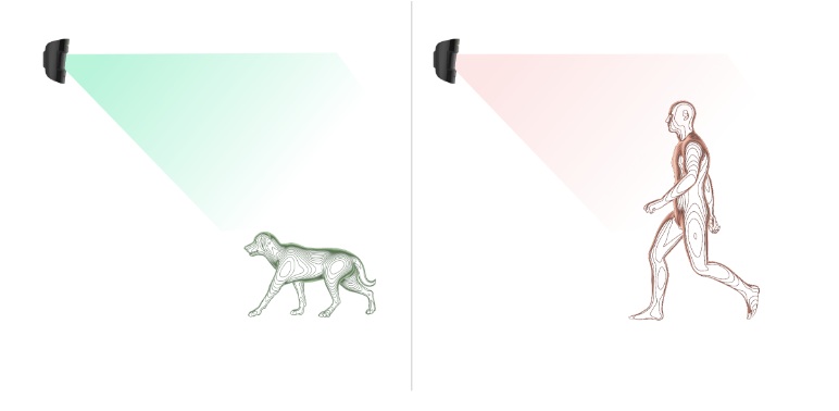Atunci când este instalat și configurat corespunzător, MotionProtect Plus nu reacționează la animalele cu o înălțime de până la 50 de centimetri și o greutate de până la 20 de kilograme.
