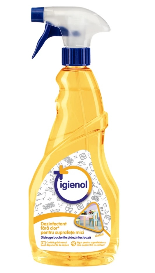 Cu o forma practica, usor de utilizat datorita pompei cu care produsul este prevazut, Igienol dezinfecteaza in siguranta suprafetele mici si obiectele din casa. Elimina 99,9% dintre bacterii, dizolva grasimea dificila din bucatarie,curata resturile intarite de sapun si depunerile de piatra din baie. Produsul poate fi folosit pe orice suprafata mica sau obiect din baie, bucatarie(cu exceptia celor care intra in contact direct cu alimentele), dormitor, cum ar fi capacul WC, vas WC, olita, clante, tastatura, mouse, intrerupator, galeata de gunoi, robineti, dus, etc. Este sigur de folosit pe orice suprafata mica, inclusiv pe lemnul nelacuit. Lasa suprafetele stralucitoare, parfumeaza placut, nu lasa urme, se usuca rapid si are un efect anti-remurdarire.