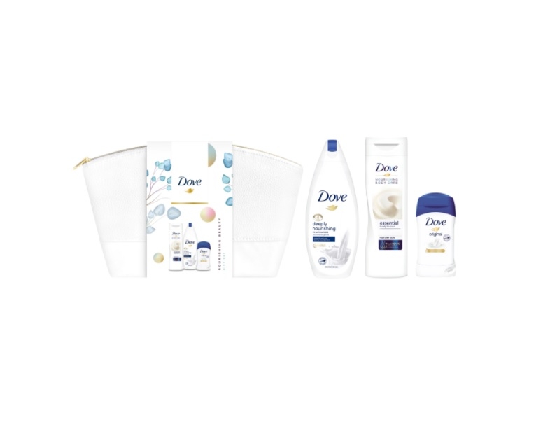 Setul Dove Original Trio + geanta pentru cosmetice contine: gel de dus, 250ml + lapte de corp, 250ml + antiperspirant stick, 40ml + geanta pentru cosmetice (cadou)