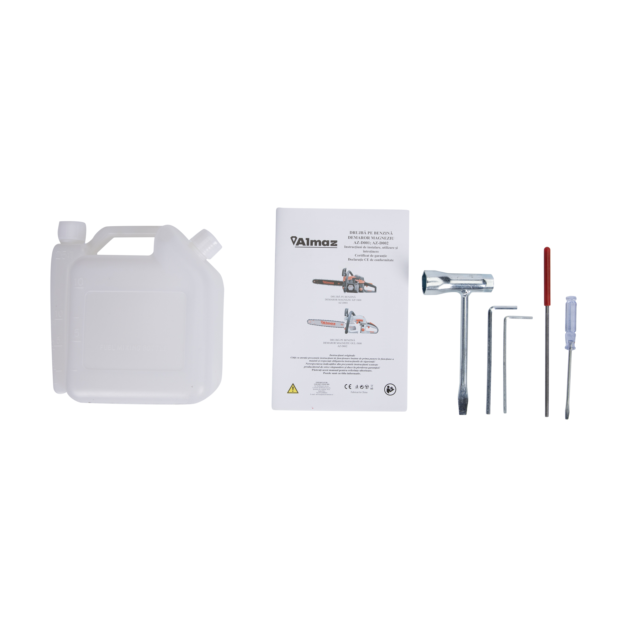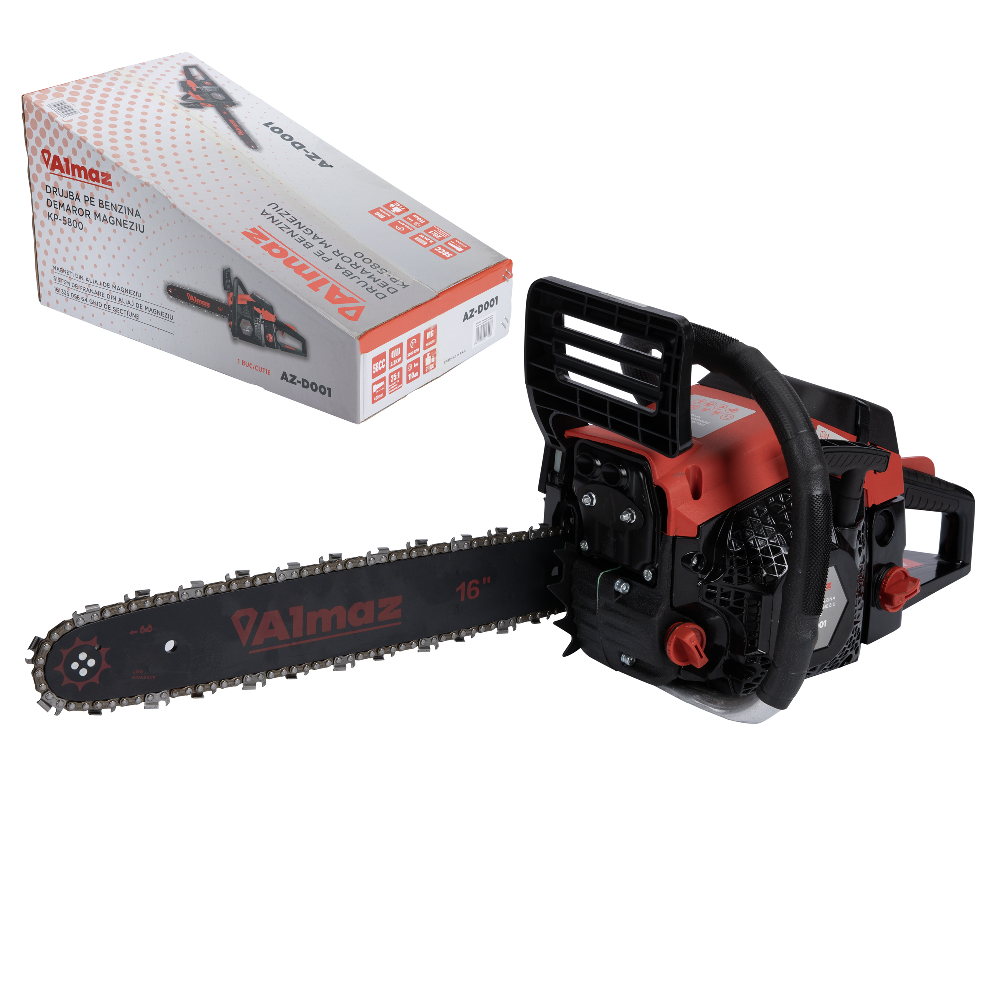Motofierastraul Almaz drujba poate fi utilizata in orice regim: professional, semiprofesional si hobby. Pornirea rapida este garantata de demarorul dublu. ALMAZ AZ-D001 este construita sa reziste in timp din materiale de calitate printre care demaror + frana din metal. Accesorii incluse drujba pe benzina demaror magneziu KP-5800, Almaz AZ-D001: •Lama drujba; •Lant drujba; •Protectie lama; •Surubenita; •Imbusuri; •Gheara; •Cheie strangere lama; •Bidon benzina; •Manual utilizare in limba Romana.Specificatii