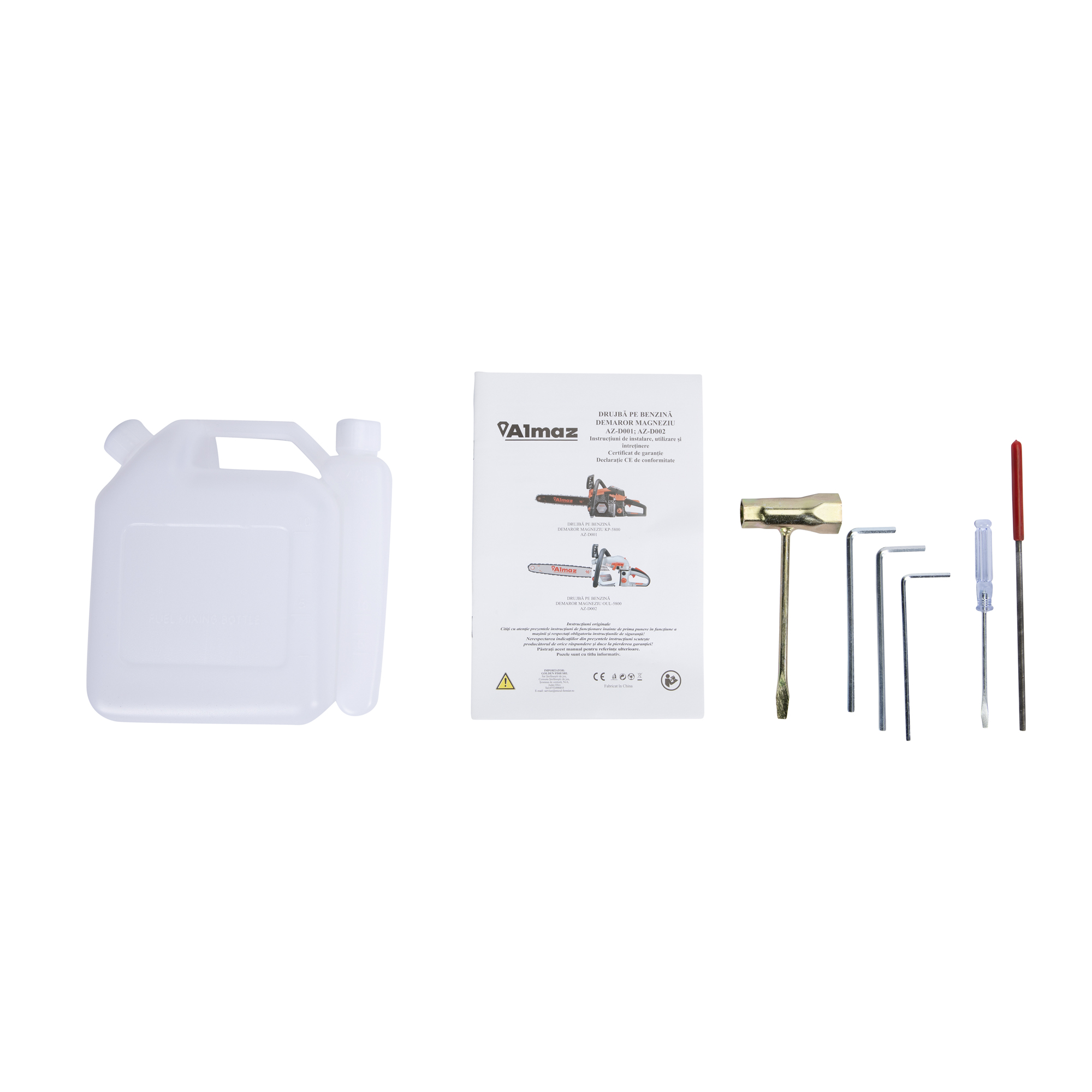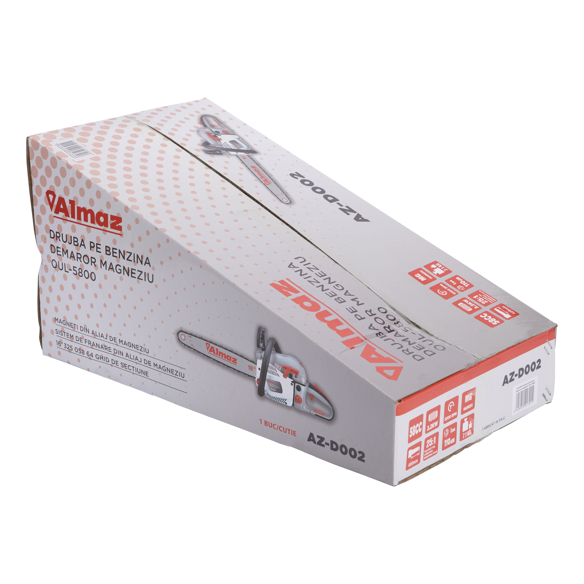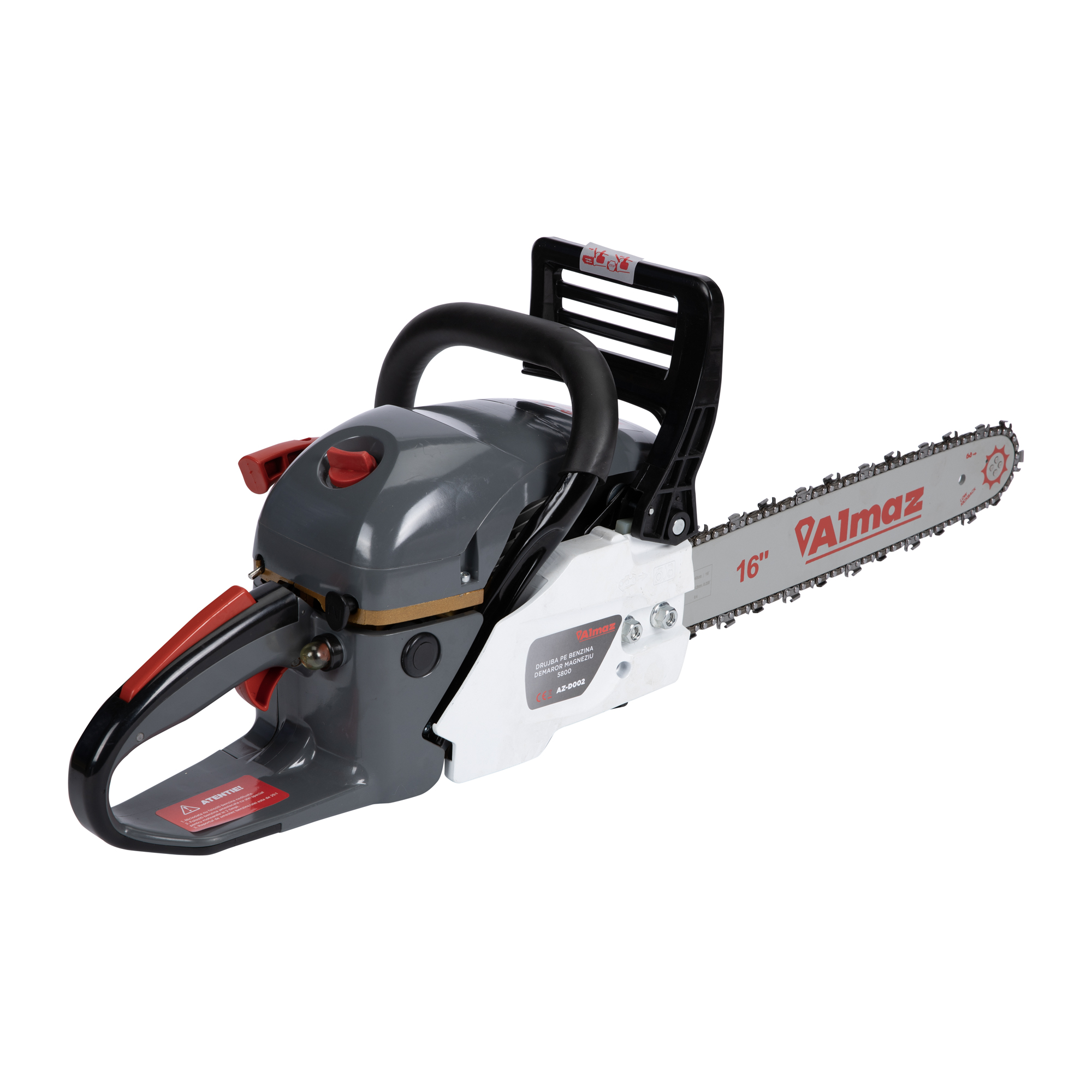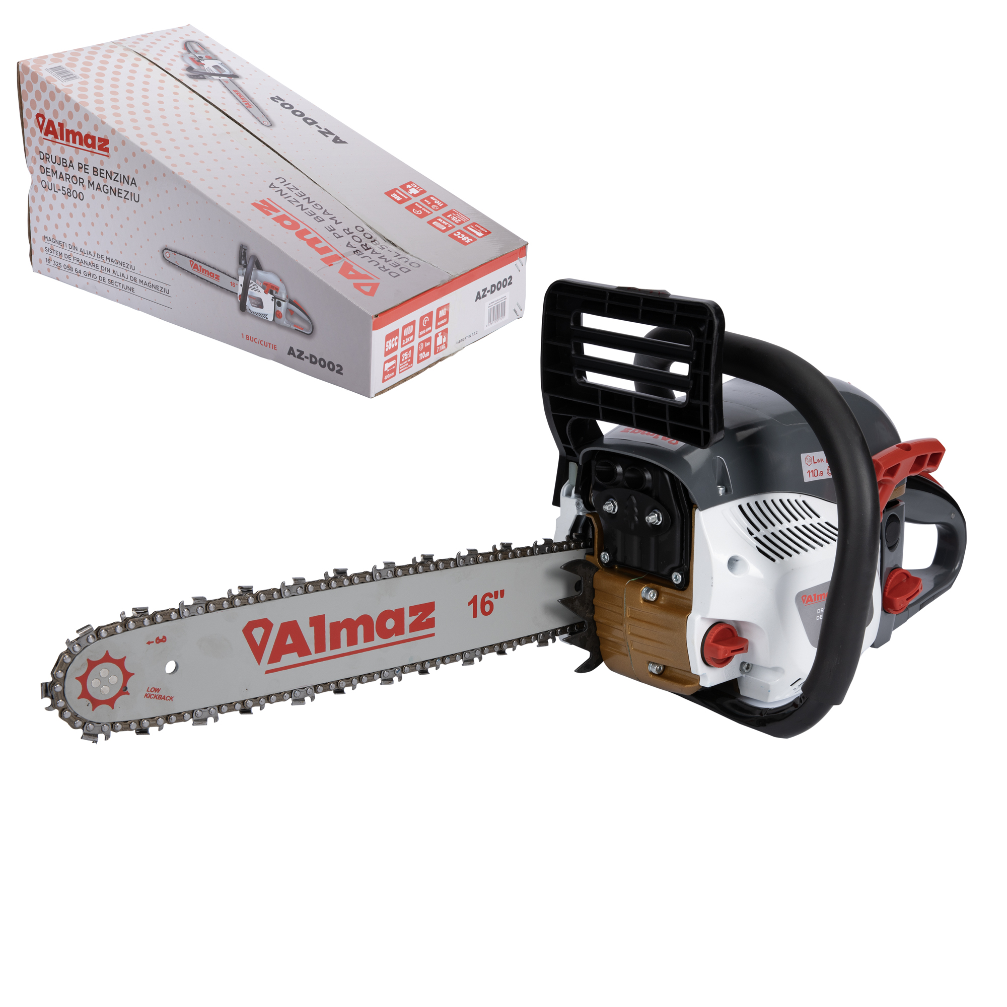 Motofierastraul Almaz drujba poate fi utilizata in orice regim : professional, semiprofesional si hobby. Pornirea rapida este garantata de demarorul dublu. ALMAZ AZ-D002 este construita sa reziste in timp din materiale de calitate printre care demaror + frana din metal. Accesorii incluse drujba pe benzina demaror magneziu OUL-5800, Almaz AZ-D002: • Lama drujba; • Lant drujba; • Protectie Lama; • Surubenita; • Imbusuri; • Gheara; • Cheie strangere lama; • Manual utilizare in limba Romana.Specificatii