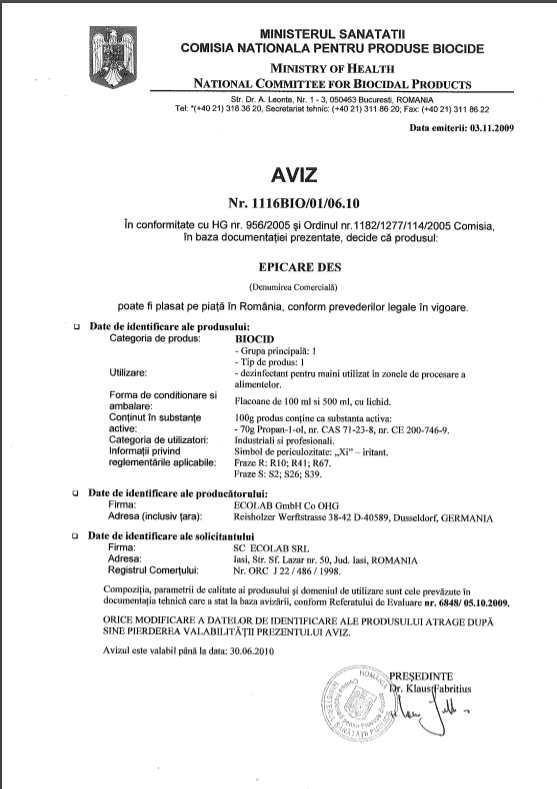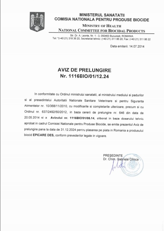 Produsul este avizat de catre Ministerul Sanatatii (biocid).