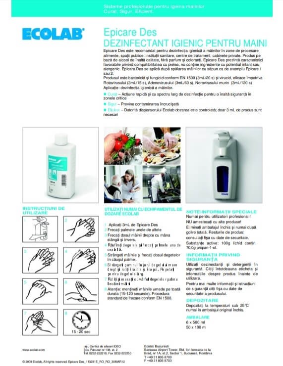 - EN 1500, Timp de contact: 3ml/ 20sec;