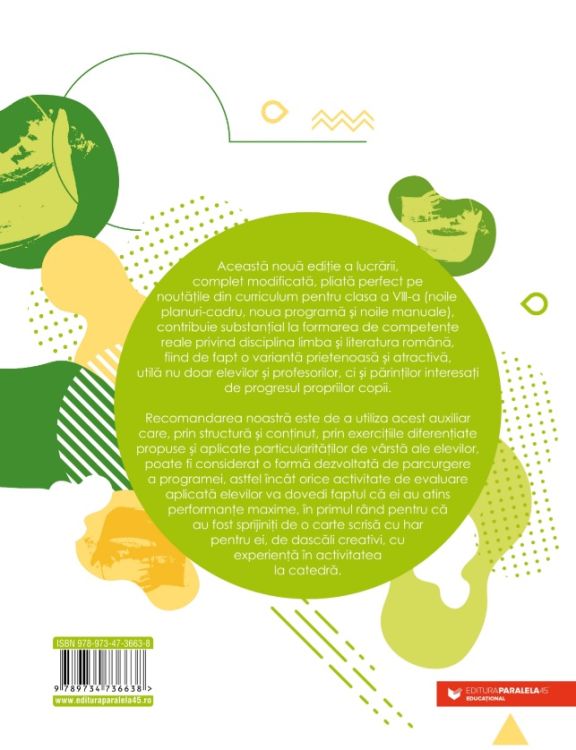 Avizat M. E. C. conform O. M. nr. 5318 21. 11. 2019 Lucrarea se pliaza perfect pe noutatile din curriculum pentru clasa a VIII-a noile planuri cadru noua programa si noile manuale si contribuie substantial la formarea de competente reale privind disciplina limba si literatura romana fiind de fapt o varianta prietenoasa si atractiva utila nu doar elevilor si profesorilor ci si parintilor interesati de progresul propriilor copii. Recomandarea noastra este de a utiliza acest auxiliar care prin structura si continut prin exercitiile diferentiate propuse si aplicate particularitatilor de varsta ale elevilor poate fi considerat o forma dezvoltata de parcurgere a programei astfel incat orice activitate de evaluare aplicata elevilor va dovedi faptul ca ei au atins performante maxime in primul rand pentru ca au fost sprijiniti de o carte scrisa cu har pentru ei de dascali creativi cu experienta in activitatea la catedra.Specificatii