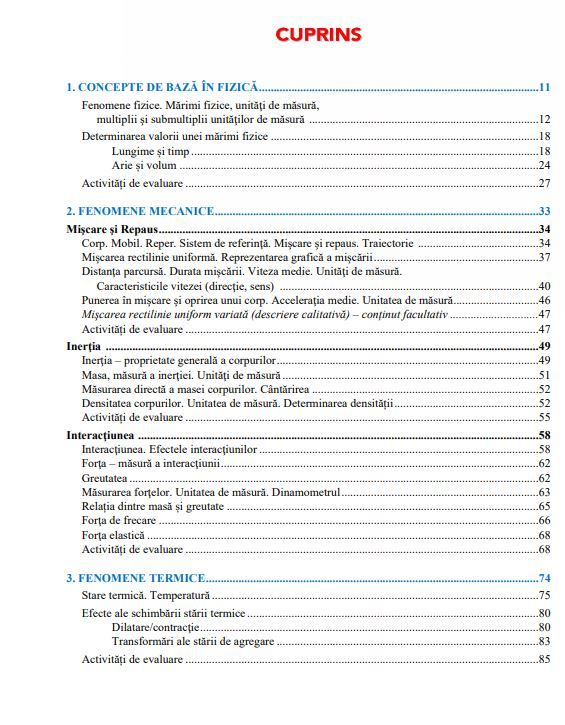 Pentru a afla ce este fizica va invitam intr-o calatorie de la cer la Pamant apoi mai departe in lumea pe care nu o mai puteti vedea cu ochiul liber. Veti fi insotiti de patru echipe de ghizi specializati pe care ii vom prezenta in continuare. Ei va vor ajuta sa intelegeti contributiile unor oameni de stiinta celebri la dezvoltarea cunoasterii noastre. Curiozitatea a ridicat privirea oamenilor spre bolta cereasca din cele mai vechi timpuri ale existentei noastre. De-a lungul timpului oamenii au botezat constelatii au urmarit miscarile corpurilor ceresti au construit telescoape in incercarea de a le vedea mai bine si mai departe. A urmat dorinta de a ajunge acolo pentru a intelege mai mult. Visul devine realitate pe masura ce trece timpul. Au fost lansate rachete si sateliti artificiali. Avem o Statie Spatiala Internationala. La ora actuala modulul Curiosity care a fost trimis de NASA sa lucreze pe planeta Marte incearca sa studieze conditiile mediului de pe aceasta planeta utilizand laboratoarele cu care este echipat. Intr-o buna zi vor exista oameni care vor locui pe alte planete din Sistemul solar. Probabil vom incepe cu planeta Marte pe care o cercetam azi. Tot curiozitatea va va indemna sa explicati o multitudine de fenomene care se intampla in jurul vostru. De ce apar tunetele fulgerele curcubeele ploaia ninsoarea si alte fenomene atmosferice Ce este electricitatea Cum putem obtine energie electrica Cum functioneaza sistemele din corpul nostru si ale celorlalte vietuitoare Din ce sunt alcatuite corpurile care ne inconjoara Exista ceea ce nu putem vedea cu ochiul liber Fizica este stiinta care raspunde acestor intrebari Si multor altora... Este una dintre stiintele naturii cea mai complexa dintre acestea. Natura este formata din corpuri. Unele au viata altele nu. Corpurile sunt alcatuite din materie. Toate corpurile au proprietati. Unele proprietati pot fi masurate altele nu. Din masurarea proprietatilor corpurilor se nasc marimile fizice. Masurarea necesita unitati de masura instrumente si procedee. Corpurile iau parte la tot felul de Intamplari pe care le numim fenomene. Unele dintre ele se numesc fenomene fizice. Spre exemplu tunetul fulgerul propagarea miscarea interactiunea corpurilor. In timpul fenomenelor fizice corpurile se supun unor legi. Pentru a descoperi sau a verifica aceste legi utilizam experimente. Adica provocam fenomenele in laboratoare sau in mediul natural. Mai multe legi care se refera la fenomene inrudite dau nastere unei teorii. O teorie este acceptata atunci cand este verificata experiinental. Asadar... Fizica este tot ceea ce se afla in jurul nostru si... chiar si in interiorul nostruSpecificatii