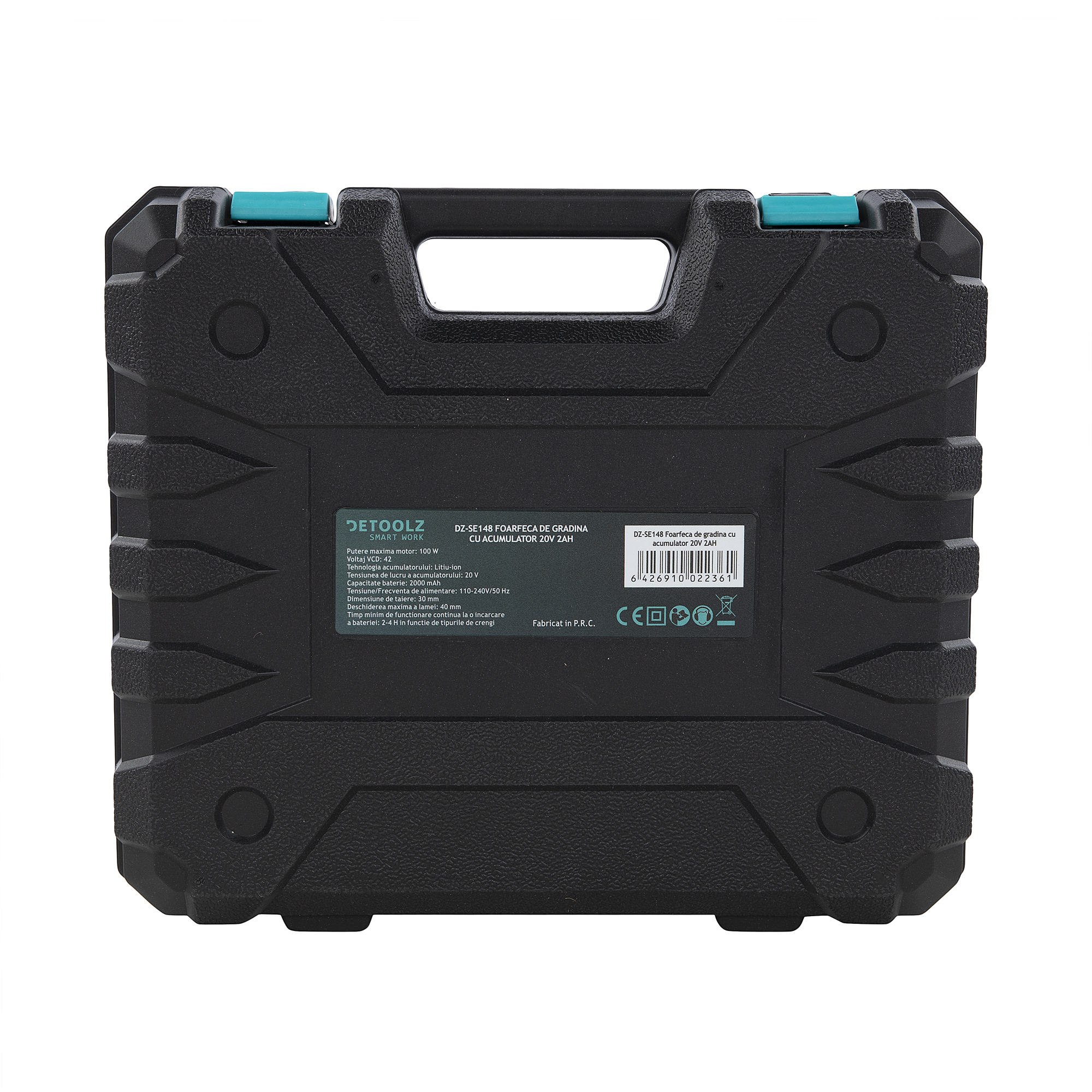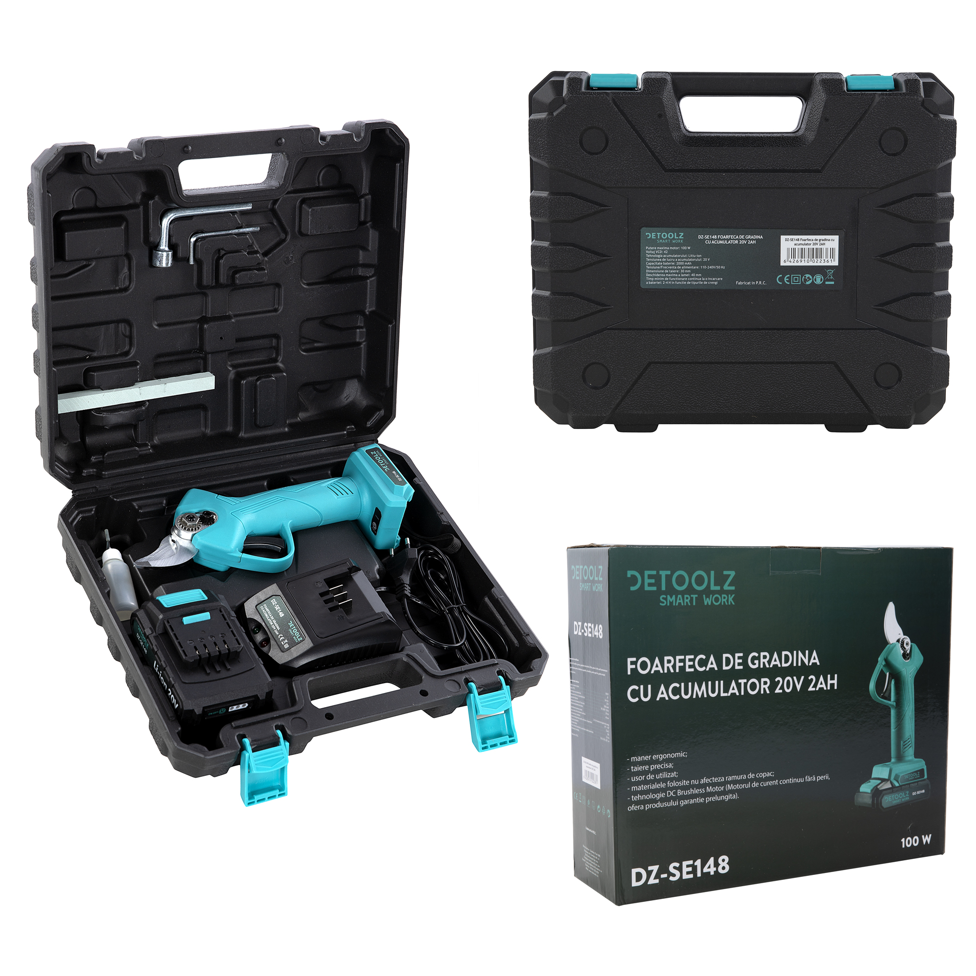 Foarfeca de gradina cu acumulator, 20V, 2Ah, Detoolz DZ-SE148 este un produs de uz gospodaresc pentru taierea ramurilor in livada de fructe, podgorii, arbori fructiferi, parcuri, pepiniere de arbusti si flori, paduri si alte spatii asemanatoare.