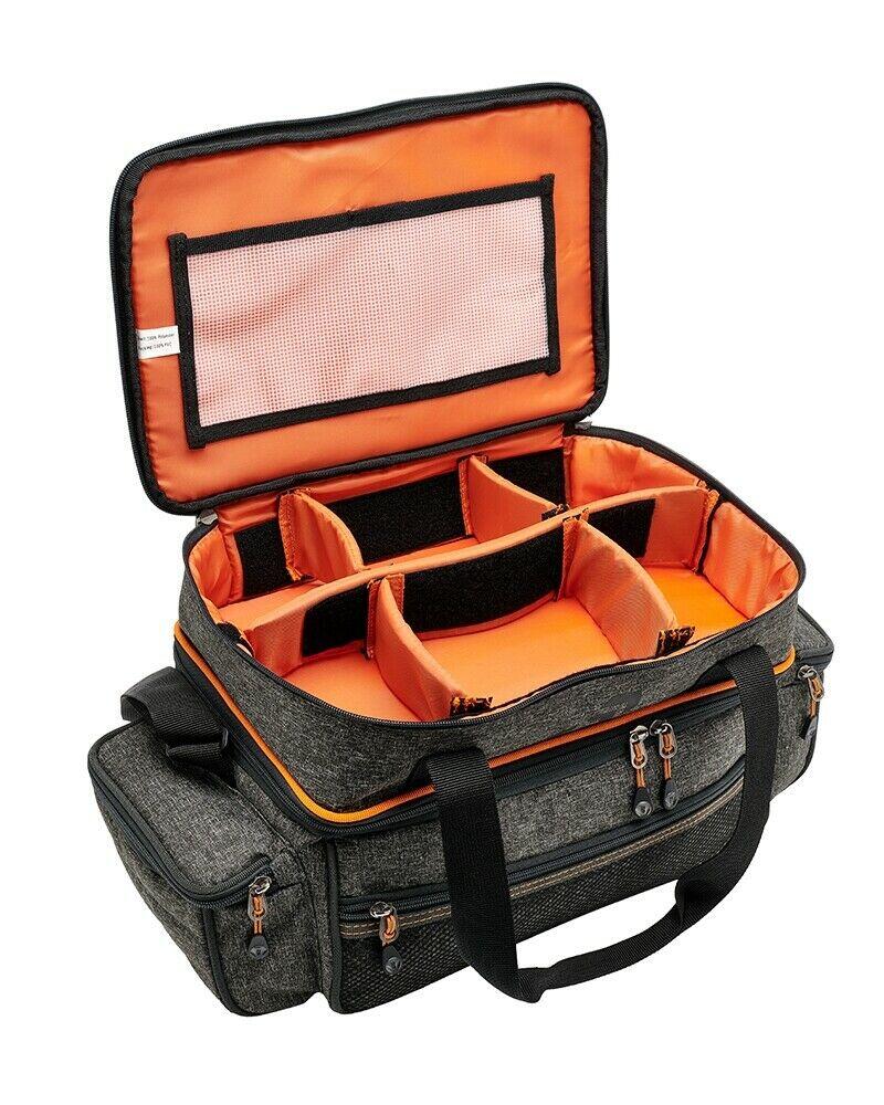Geanta practica cu forma compacta fabricata pentru a transporta o multime de echipamete necesare unei partide de pescuit. Cu doua compartimente principale, pozitionate unul deasupra celuilalt. Compartimentul inferior ofera o capacitate de 25x38x15cm si un buzunar de tip plasa cu fermoar, in timp ce al doilea compartiment, cel superior dispune de cinci pereti despartitori detasabili pentru a presonaliza dupa bunul plac spatiul.