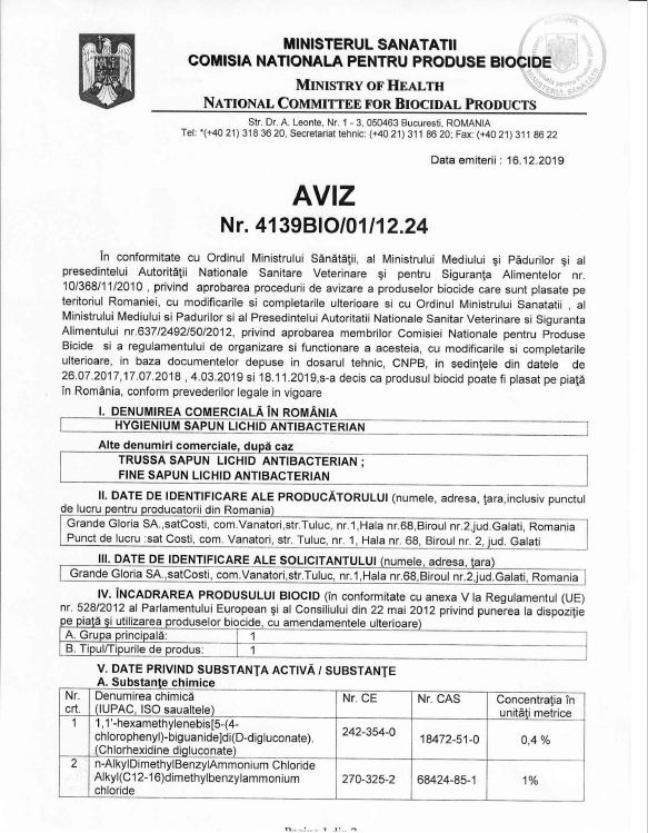 TP1: Produsele din această categorie sunt produse biocide utilizate pentru igiena umană, aplicate pe sau care intră în contact cu pielea umană sau cu pielea capului în scopul principal de a dezinfecta pielea sau pielea capului.