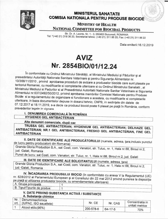TP1: Produsele din această categorie sunt produse biocide utilizate pentru igiena umană, aplicate pe sau care intră în contact cu pielea umană sau cu pielea capului în scopul principal de a dezinfecta pielea sau pielea capului.